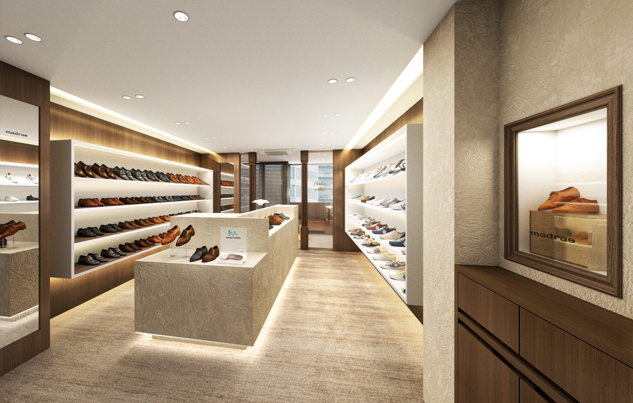 2階:メンズフロアでは、マドラスの100年を超えた靴づくりの意匠を体感できるシックな空間にリニューアル。metaインソール搭載シューズや各マドラスオーダーシューズシステムを取り扱い、変容する日々を様々な印象にドレスアップしてくれる、魅力的な1足に出会えます。