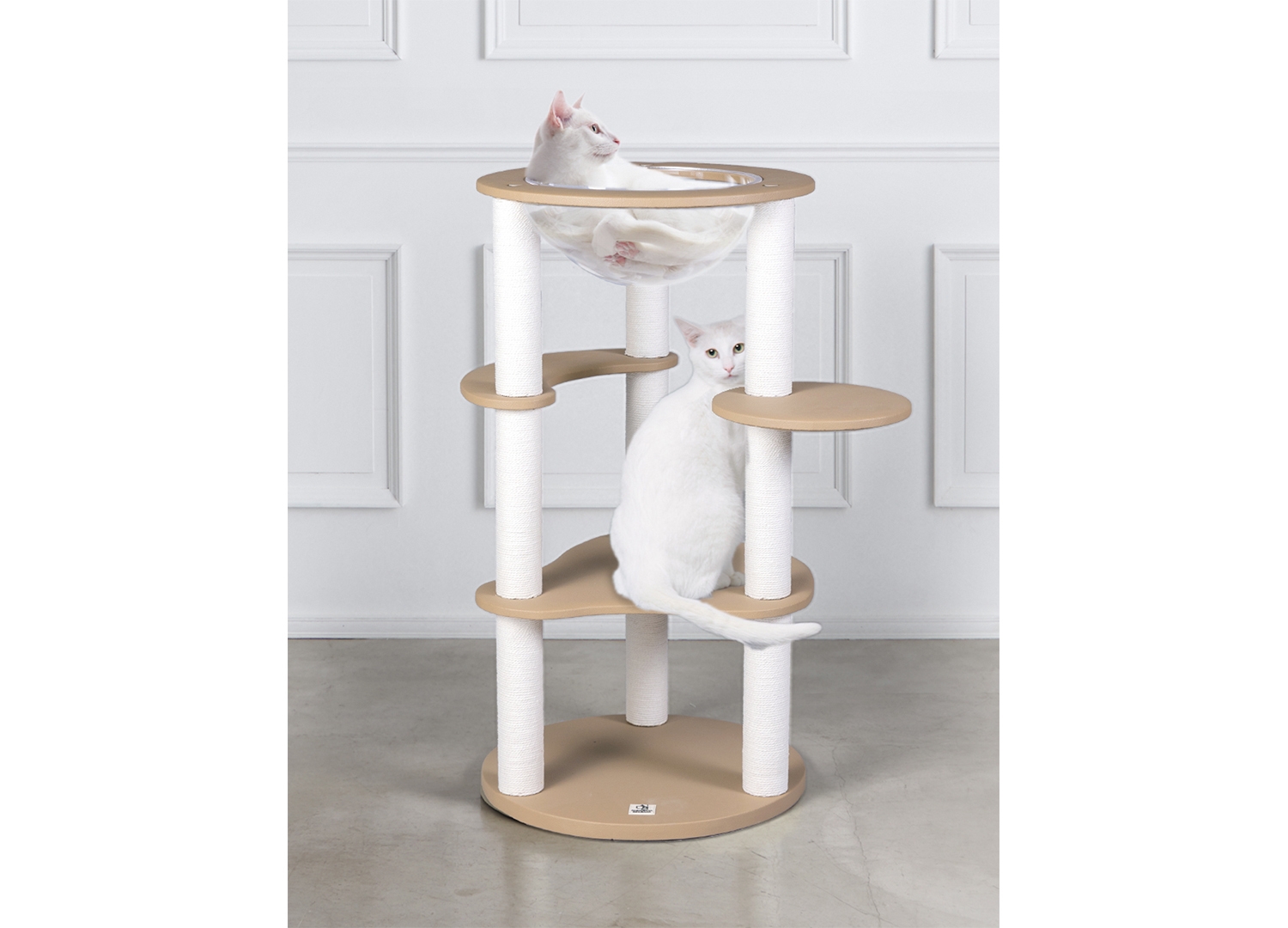宇宙ステーションのようなスケルトンボウルは大きめでゆったり。おねこさまにとってはお昼寝に、ご主人さまにとっては肉球をじっくり観察できる特等席です。2本の柱で固定されているので安定感抜群。ステップと付け替えが可能で猫ちゃんの性格や運動能力に合わせてカスタマイズできます。