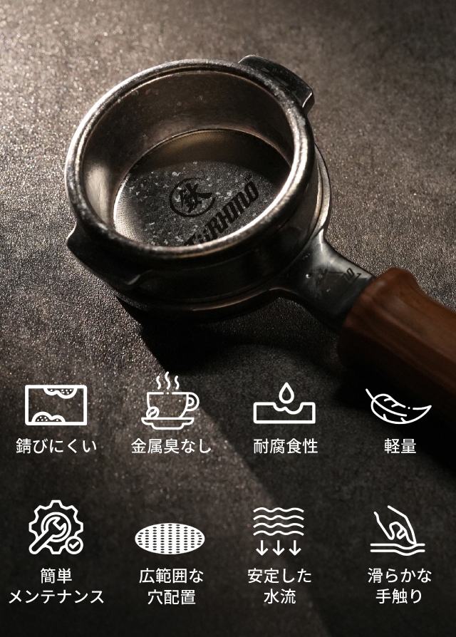 チタンは錆びにくく、金属臭がなく、軽量で高耐久。さらに高精度の加工によって、均一な穴配置と安定した抽出を可能にしました。これにより、従来のステンレス製パーツでは難しかった「豆本来の風味を損なわないピュアなエスプレッソ」を家庭でもお楽しみいただけます。