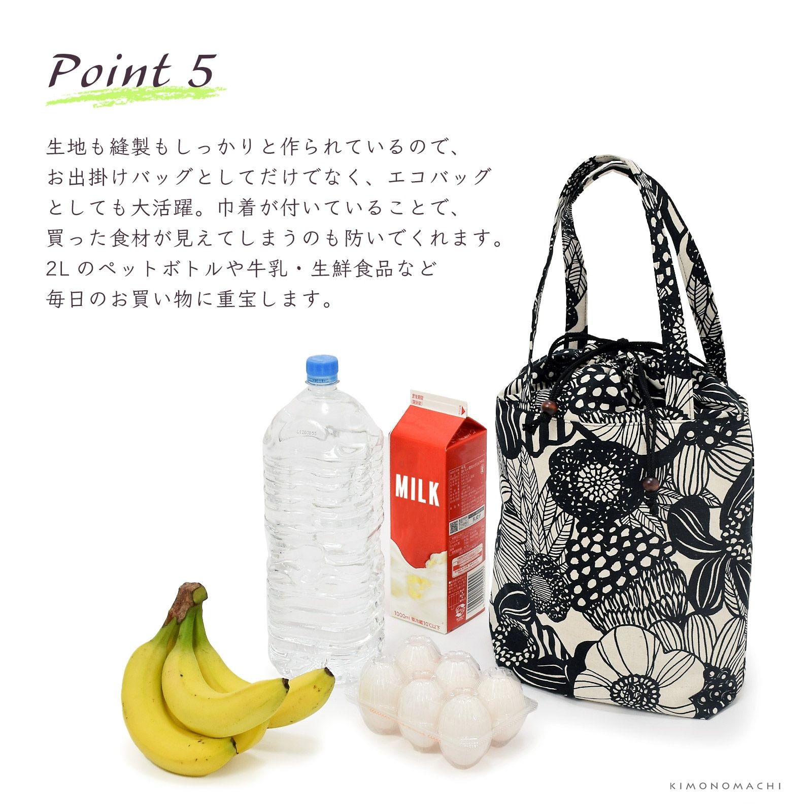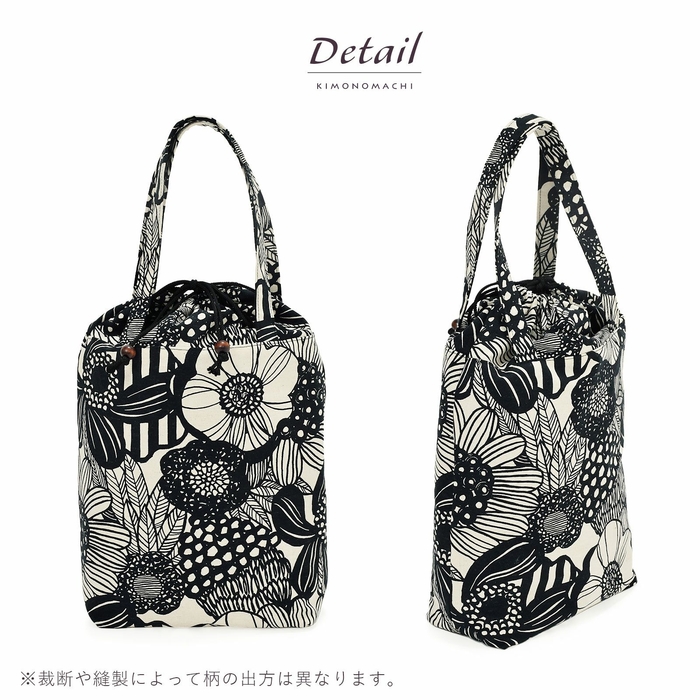 生地も縫製もしっかりと作られているので、お出掛けバッグとしてだけでなく、エコバッグとしても大活躍。巾着が付いていることで、買った食材が見えてしまうのも防いでくれます。