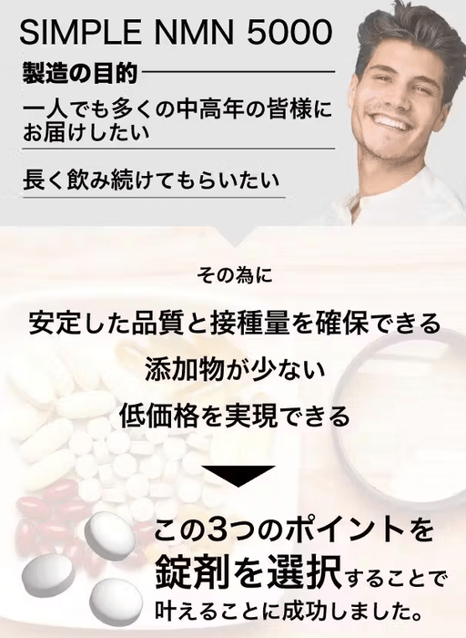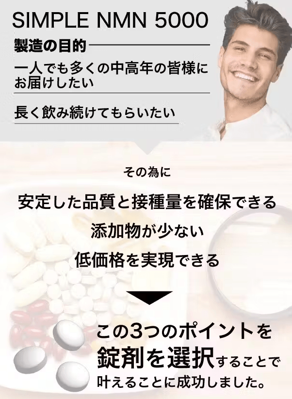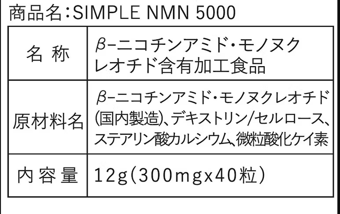 余計な成分は一切入っていません。NMNを錠剤として成立させるために必要な最低限の成分のみで製造しています。
