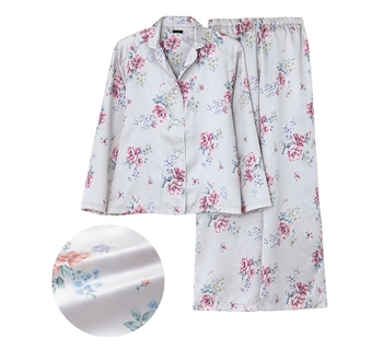 本商品は、しなやかな肌あたりと上品な光沢感のあるバターサテン素材を採用。襟元のシルエットがかわいらしい シャツスタイルのデザインで、小花柄とフルーツメッセージ柄、トレンドのボタニカル柄をラインアップしました。リラックスタイムにぴったりの素材と大人かわいいデザインにこだわったおうち時間もかわいく、楽しく過ごせるパジャマです。
