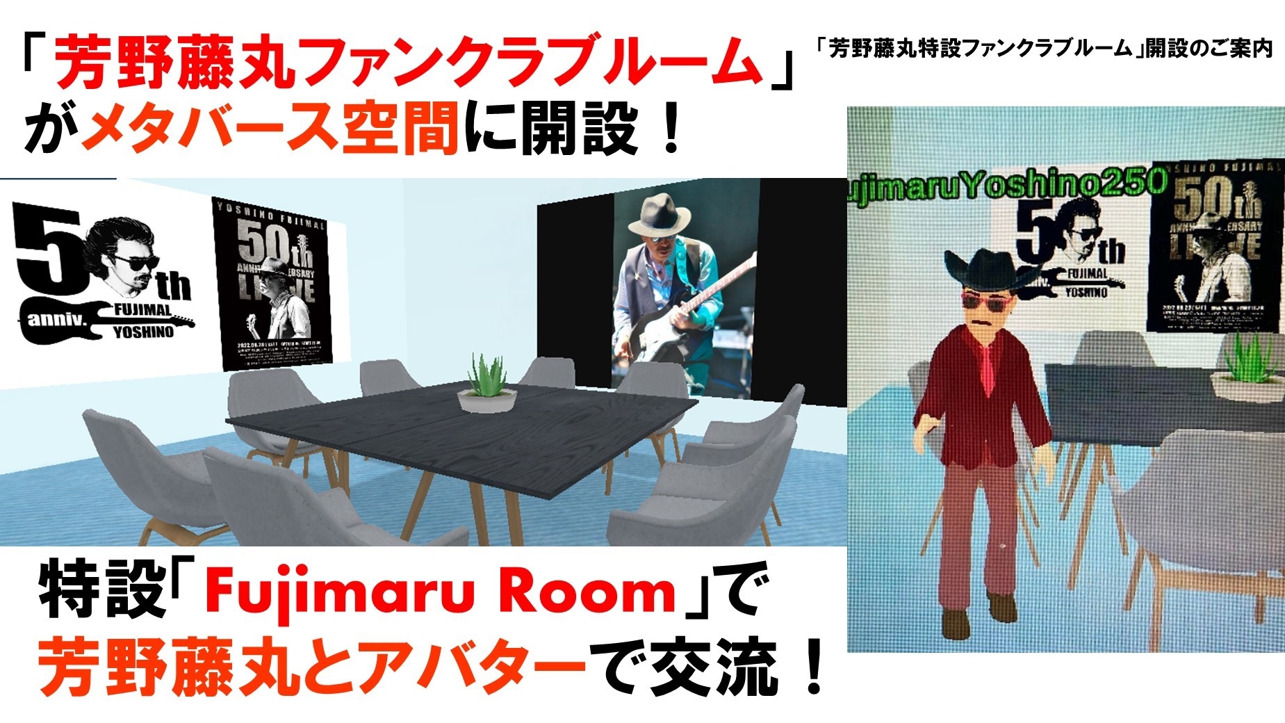 今年活動50周年となる伝説のギタリスト芳野藤丸ファンクラブが メタバース上に開設される他、金融不動産業界特化型の 独身交流クラブがメタバース上で設立。