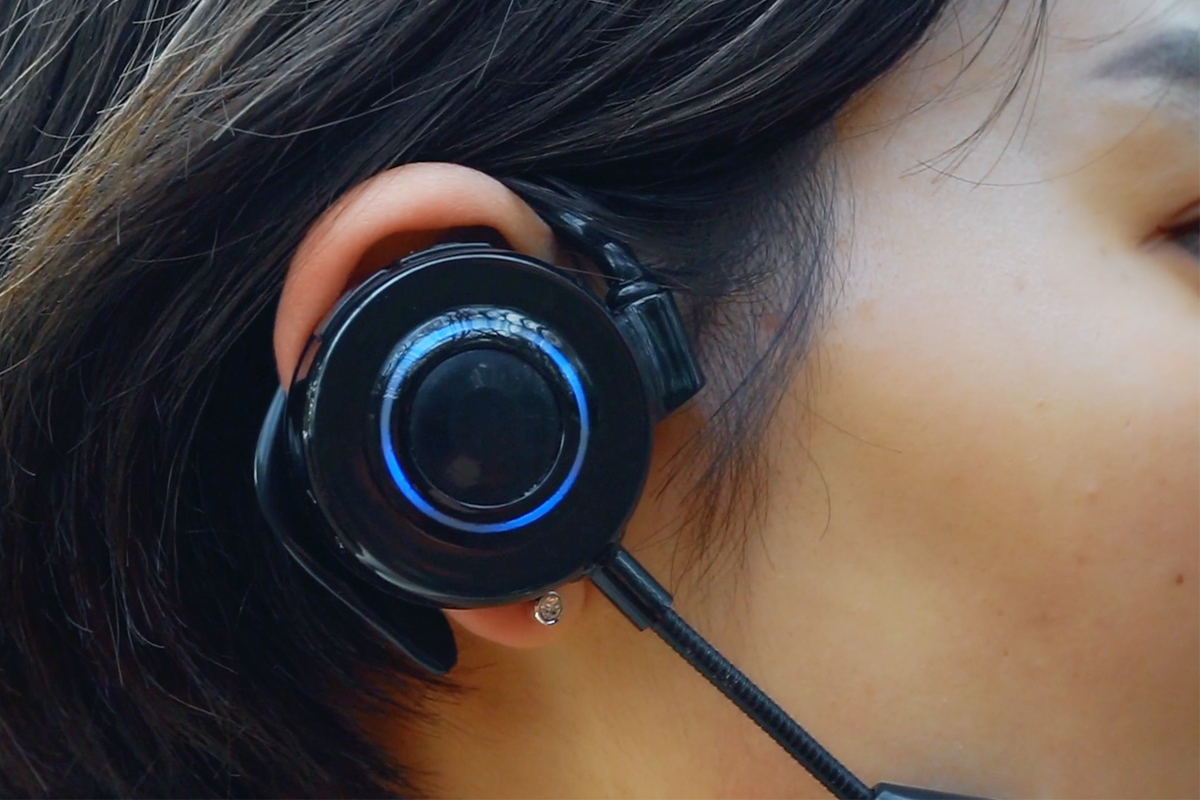 デザインとしては、すぐに見て分かる通り、耳掛け式で、先端にはスピーカーが付いております。商品の概要としては、自分が話した言葉を本体が聞き取り、Bluetoothで繋がったスマートフォン経由で、そのスピーカーから、声が発信されます。また目の前にいるヒトの声も聞き取って、翻訳をしてくれます。