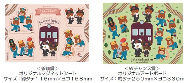 スタンプ台紙に付属している「Wチャンス賞応募券」と、5月22日(水)~7月8日(月)に本コラボレーショングッズ発売店舗(「ジャッキーのおみせ」、「とりクロ」を除く)にて「くまのがっこう」グッズまたは阪急電車グッズを1点以上お買い上げのレシートの2点を郵送いただくと抽選で100名様にオリジナルアートボードを進呈します。