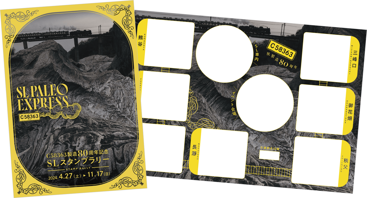 傘寿を象徴する「濃黄色」を使用し、C58363の長い歴史を表現したスタンプ台紙に、SL停車駅やSL車内、指定イベント会場をめぐってスタンプを集めます。