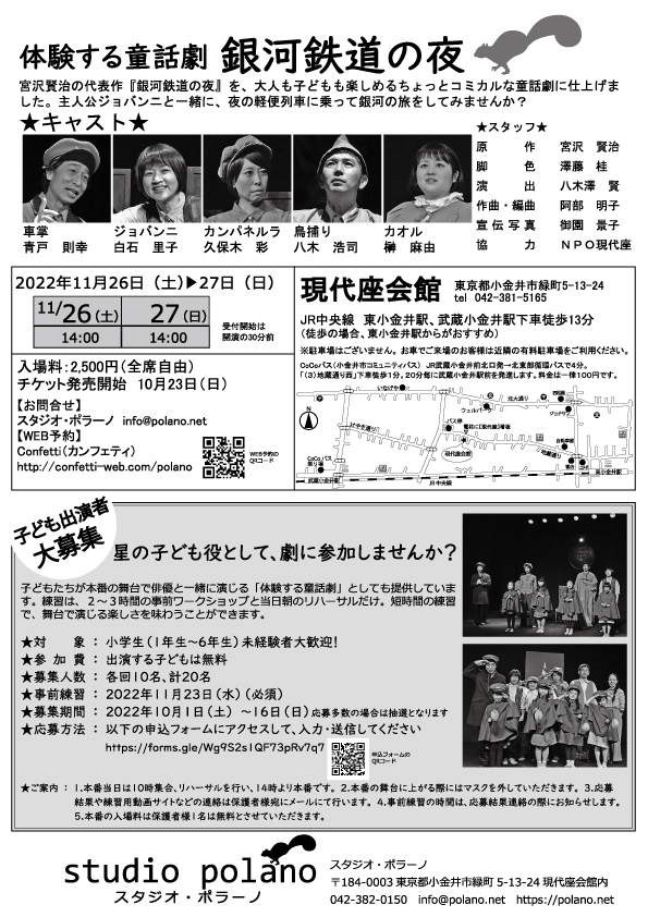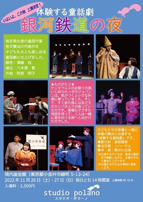 スタジオ・ポラーノ(東京都小金井市、代表:八木澤 賢)主催、体験する童話劇『銀河鉄道の夜』が2022年11月26日 (土) ~2022年11月27日 (日)に現代座会館(東京都小金井市緑町5-13-24)にて上演されます。