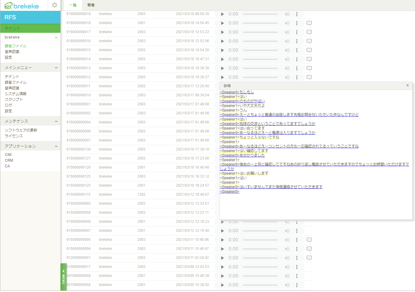 株式会社日本ブレケケ(本社:東京都豊島区、代表取締役:山出 晋)は、Brekeke PBX(Ver 3.10.2.8以降)で録音されたステレオ音声のテキスト化に対応したパッケージソフトウェア『Brekeke Recording File Server』(以下、Brekeke RFS)の新バージョンを2021年6月1日より提供開始します。従来のBrekeke RFSではモノラル音声のテキスト化のみ可能でしたが、新バージョンではステレオ音声にも対応し、認識結果を話者分離して表示できるようになりました。
