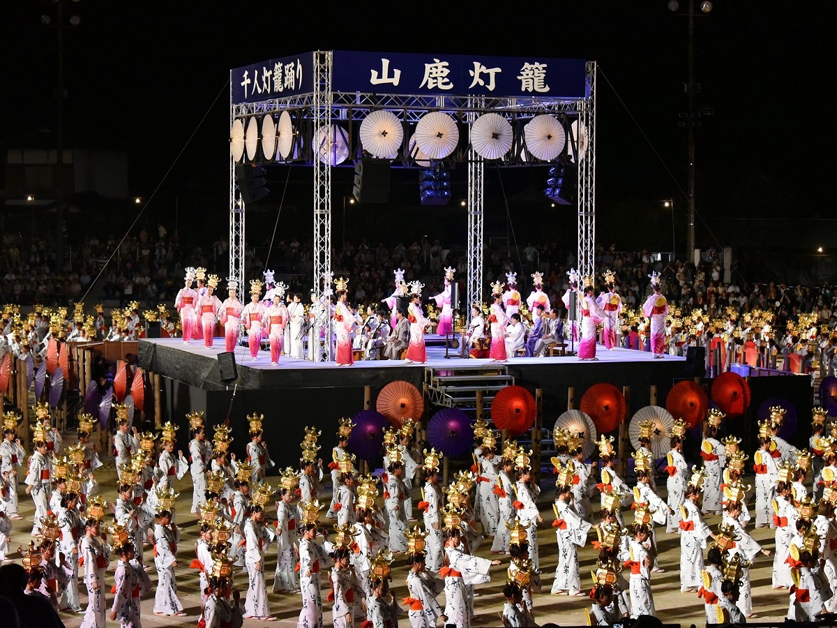 4年ぶりに開催される山鹿灯籠まつりは、8月15日(火)は花火大会、16日(水)は頭に金灯籠を掲げた浴衣姿の女性たちが「よへほ節」にのせて踊る「千人灯籠踊り」がメインイベントとして開催されます。
