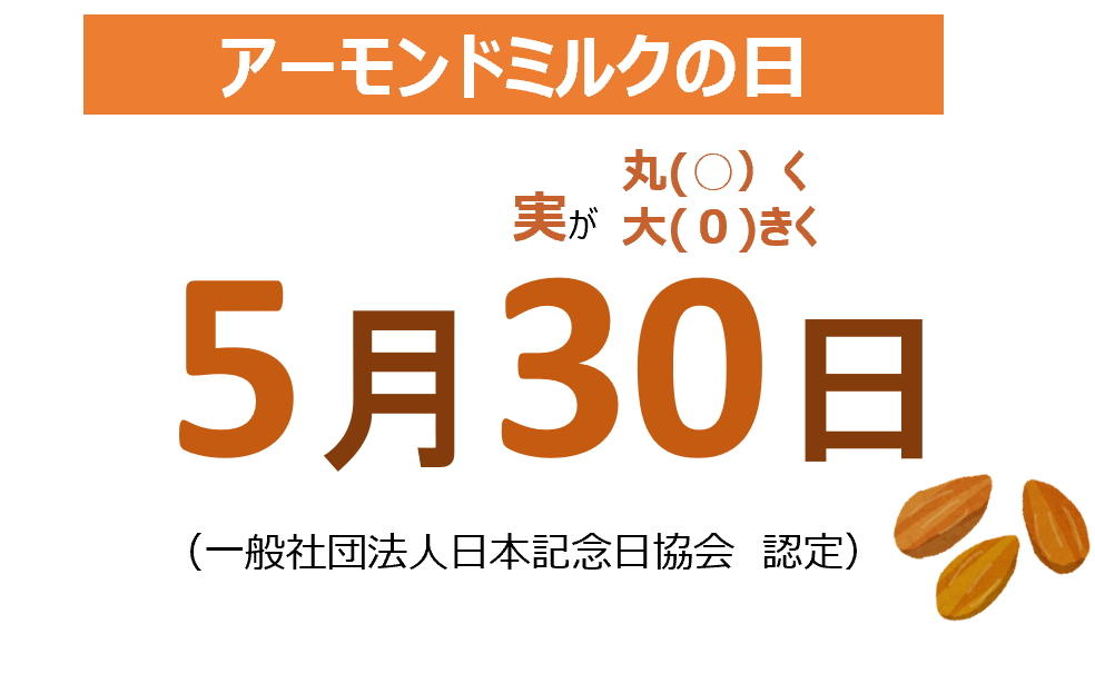 アーモンドの実は5月の下旬ごろになると、丸く・大きくなります。そこで、3を「実」、0を「丸」と「アルファベットのO(オー)」に見立てて「実が丸く・大きく」と表現し、5月30日がアーモンドミルクの日として日本記念日協会に認定されました。