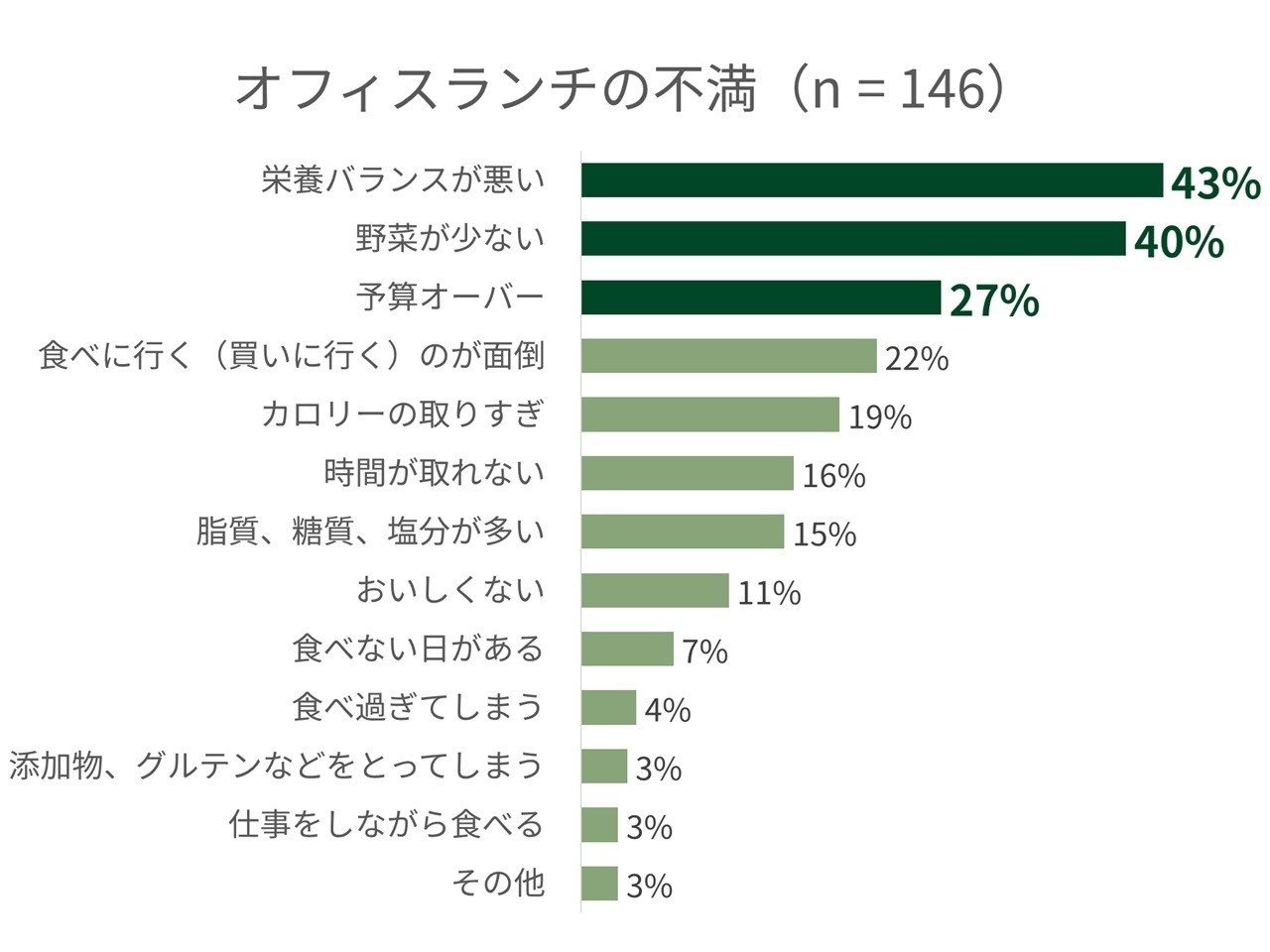 オフィスランチの主な不満は「栄養バランス(43%)、野菜が少ない(40%)、予算オーバー(27%)」の3つ。