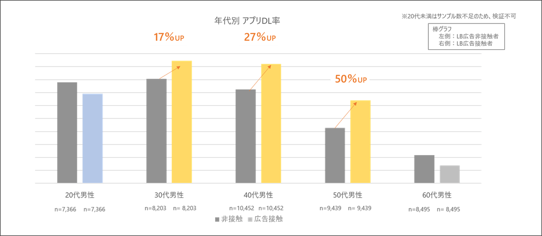 広告接触者全体では、非接触者と比較しダウンロード率が10%アップ。今回のターゲットであった男性に絞ると、15%のアップが確認出来た。
