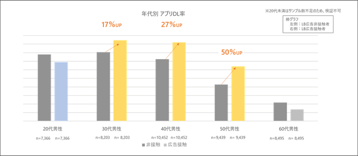 50代男性においては、非接触者と比較し広告接触者のダウンロード率は50%のアップ。