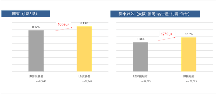 デジタルサイネージの配信エリアを関東と関東以外、に分けて分析。いずれにおいても広告接触によるダウンロード率のアップが見られたが、特に関東以外においてその効果が大きかった。