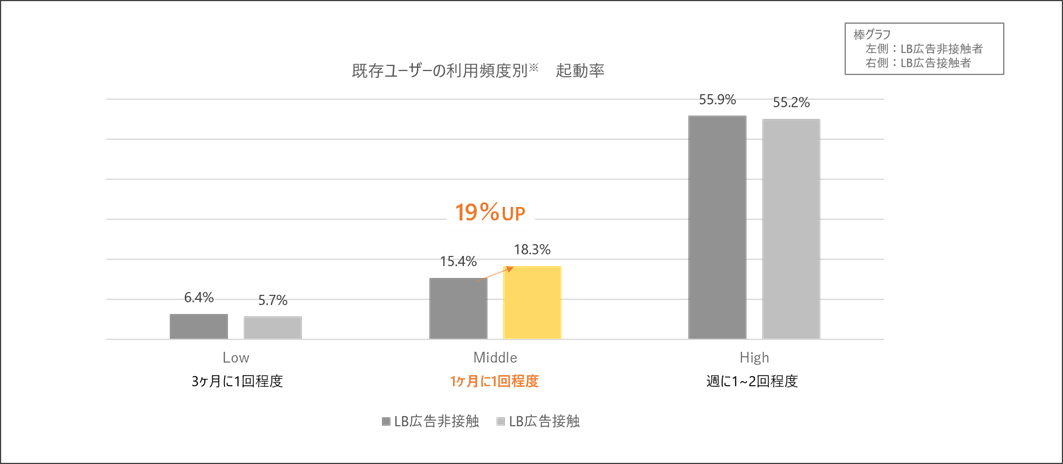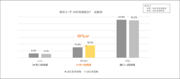 既存Paraviユーザーの利用頻度別にアプリ起動率を比較すると、月に1回程度アプリを起動するミドル層において、広告接触により起動率のリフトが見られた。