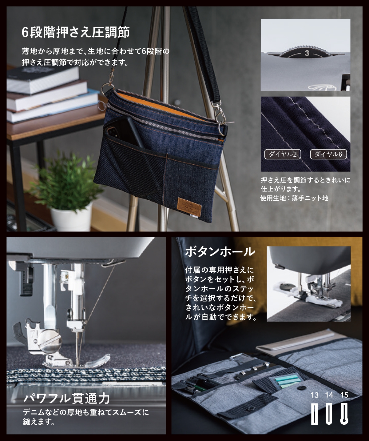 その他、厚手のデニムも重ねて縫えるパワフルな貫通力、表から目立たないほつれ止め縫い、面板が開閉する簡単メンテナンス、困った時には使用方法動画にアクセスできる二次元バーコード、厳選された30ステッチ内蔵など、様々な機能が思い描く作品イメージを実現に導きます。