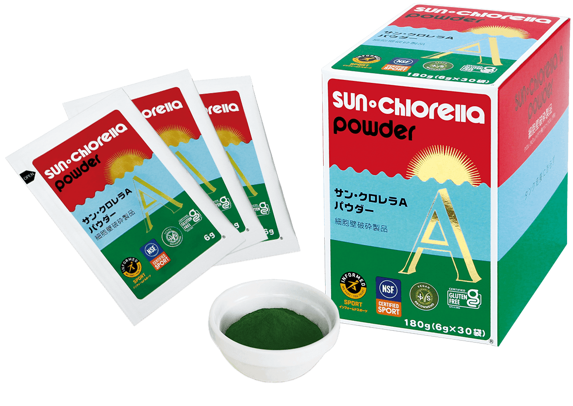 サン・クロレラAパウダーは、緑藻類であるクロレラを100%使用した健康食品です。良質なタンパク質をはじめ、ビタミン、ミネラル、食物繊維や葉酸など身体に不可欠な栄養素がバランスよく含まれています。クロレラは、精製されたサプリメントのように特定の栄養素を摂るのではなく、“自然のまま”生命が持つ栄養素を余すことなく摂ることができ、身体を健やかに保つことができます。近年、クロレラの持つ栄養成分が注目され、多くのアスリートに活用いただいております。また、アンチドーピング認証を取得していますので、プロのアスリートからスポーツを楽しむ方まで安心して飲用いただけます。
