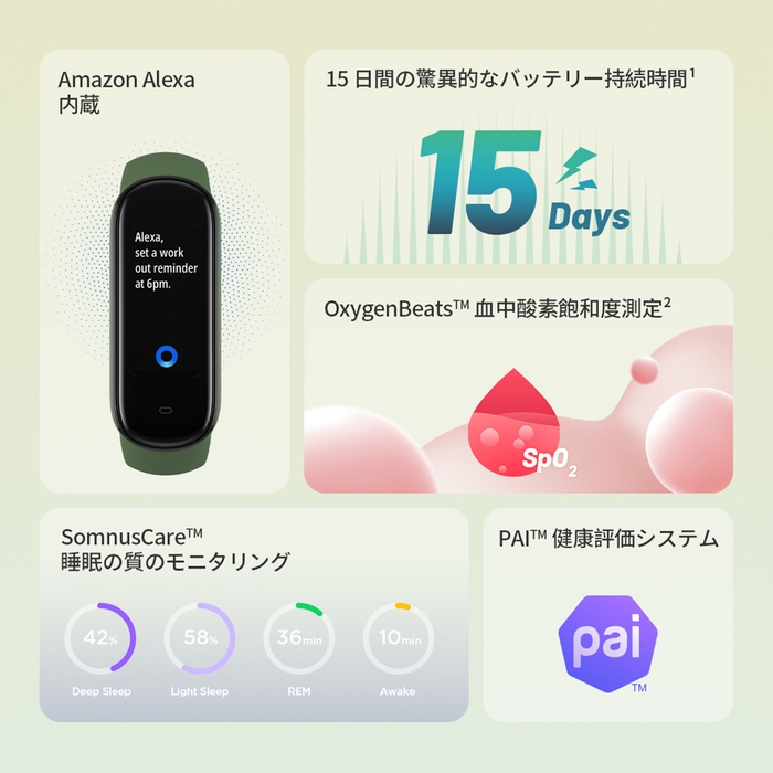 またAmazfit独自開発のPAI(パーソナルアクティビティインテリジェンス)は、 サイエンスに基づくヘルススコア機能であり、個々の身体状況を加味したうえで、 最適な運動状況を教えてくれます。