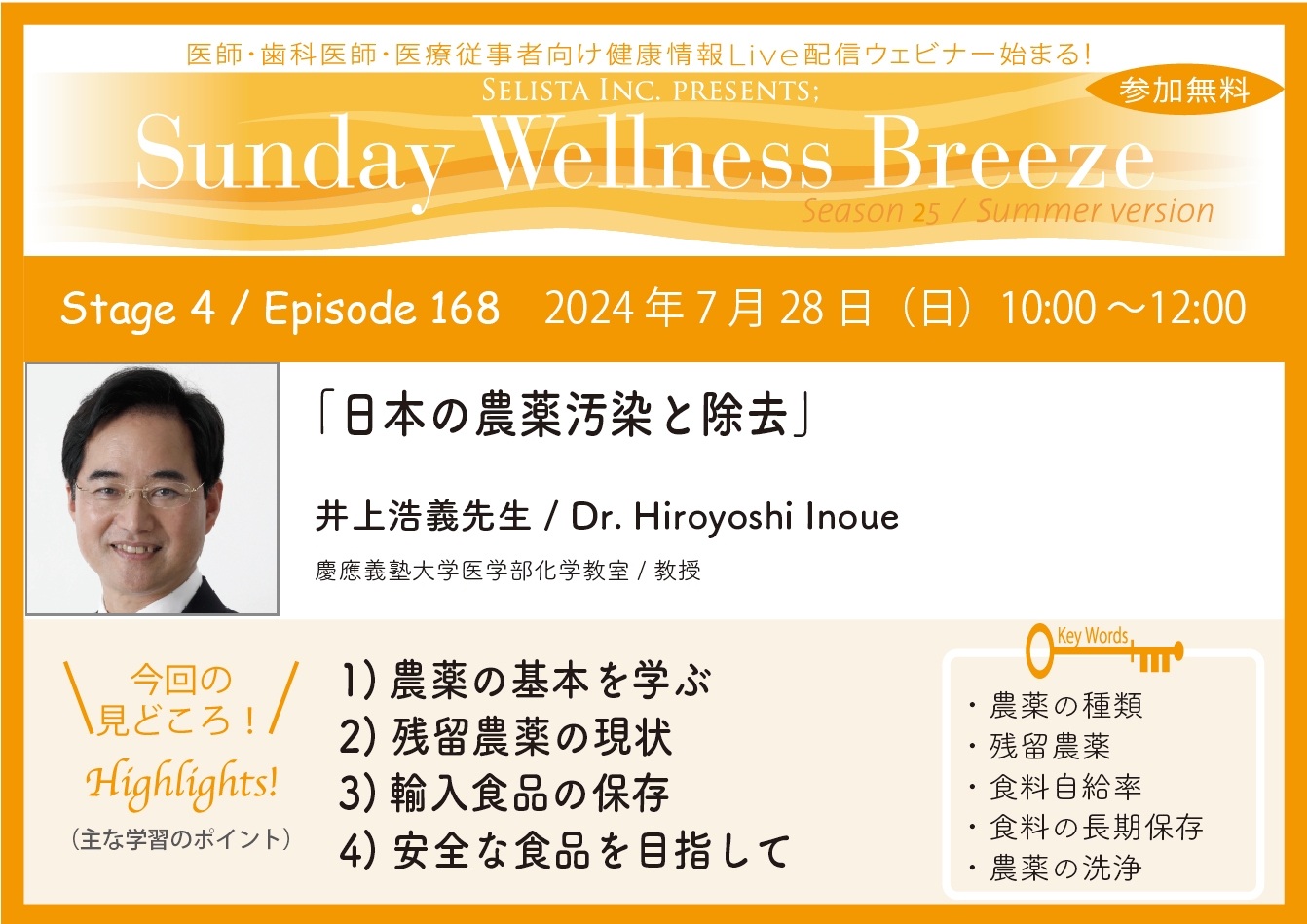 《医師・歯科医師・薬剤師向け》 無料オンラインセミナー7/28(日)朝10時開催 『日本の農薬汚染と除去』 講師:井上 浩義 先生(慶應義塾大学医学部化学教室/教授)