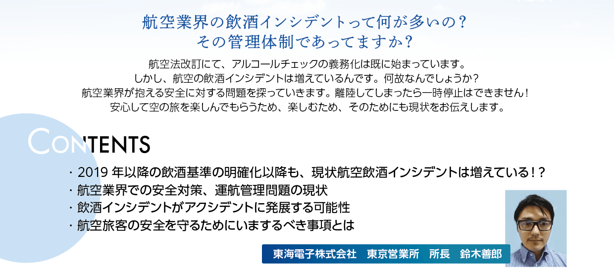 アルコール検知システム、 IT点呼システム、 運行管理システムを開発・販売する東海電子株式会社(本社:静岡県富士市 代表取締役 杉本 哲也)は、 この度、航空業界が抱える安全に対する問題を探る「航空業界の現状。見えない真実。」無料ウェビナーを12月12日(火)に開催いたします。
