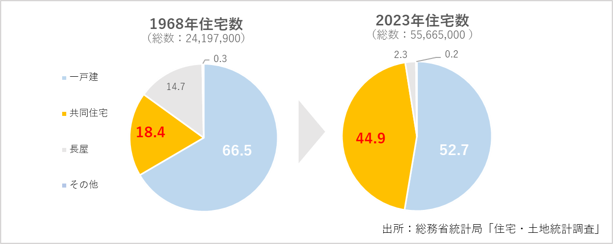 総務省統計局の住宅・土地統計調査によると、1968年には全住宅に占める共同住宅の割合が18.4%だったのに対し、2023年には44.9%まで増加しています。