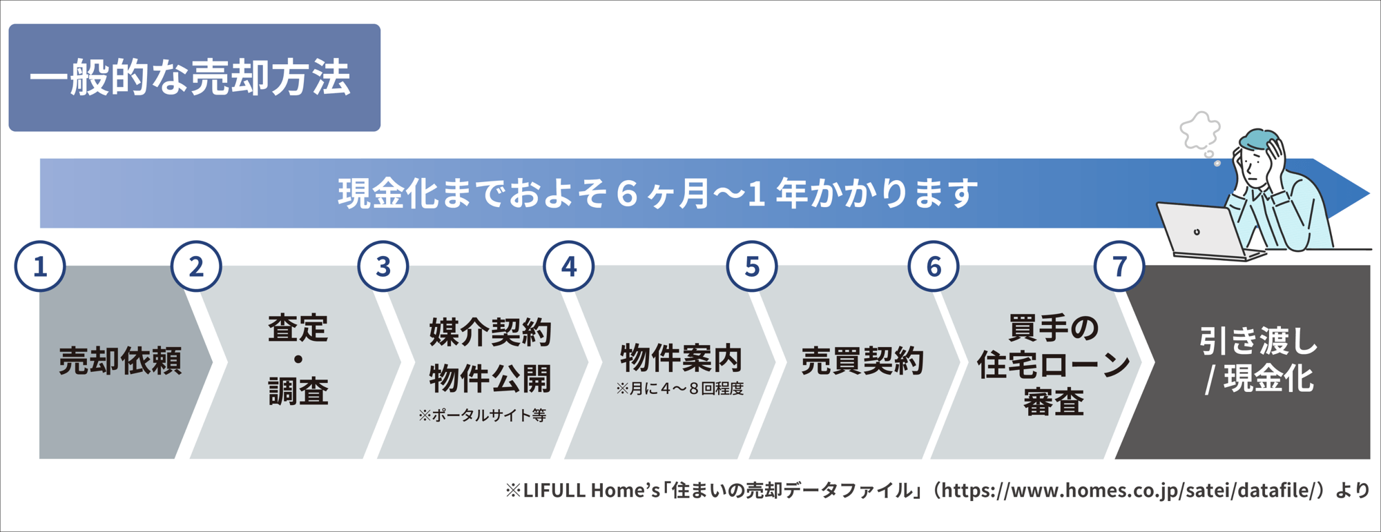 「実家じまい(マンションじまい)」には時間もかかります。仲介会社を利用して売却する場合、売却相談から残金決済(引渡し)までの平均期間はおよそ6か月~1年です。