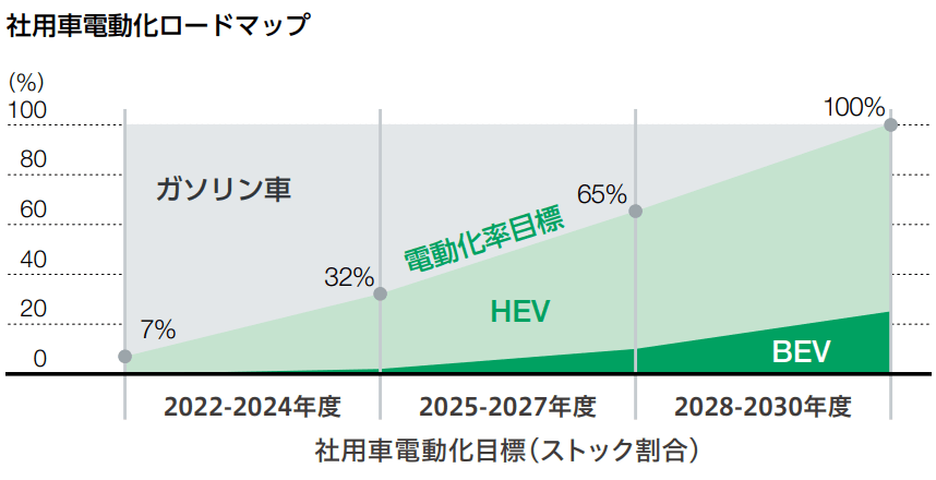 ■現状・現在グループ全体で業務用車両を約1万1千台保有・業務用車両によるCO2排出はスコープ1,2合計の約3割にあたる・2022年2月から、電気自動車のパイロット導入にも着手し、普及に向けた検証等を実施■目標・2022年5月に、2030年までに業務用車両の100%電動化の達成を目指すことを発表・電気自動車など電動車の導入を積極的に行い、現在約11%の電動化率を計画的に向上