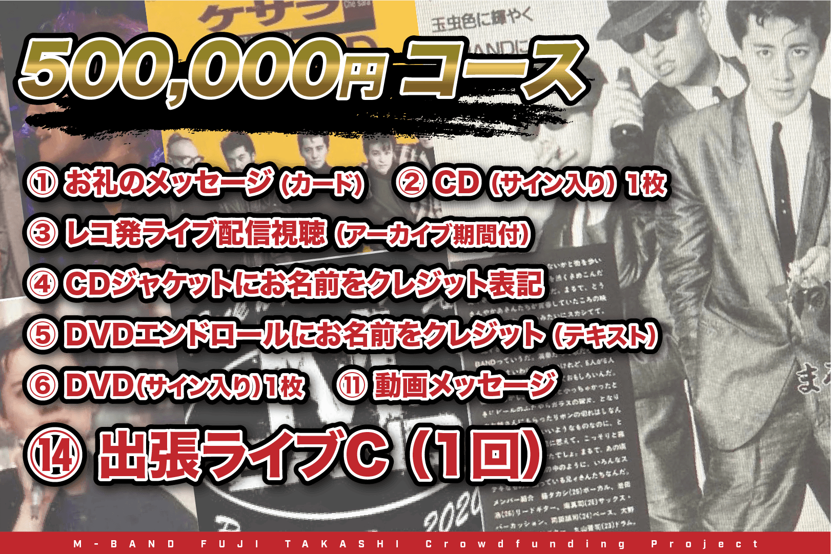 ◆500,000円コース (1)お礼のメッセージ(カード)、(2)CD(サイン入り) 1枚、(3)レコ発ライブ配信視聴(アーカイブ期間付)、(4)CDジャケットにお名前をクレジット表記、(5)DVDエンドロールにお名前をクレジット(テキスト)、(6)DVD(サイン入り)1枚、(11)動画メッセージ、(14)出張ライブC(1回)