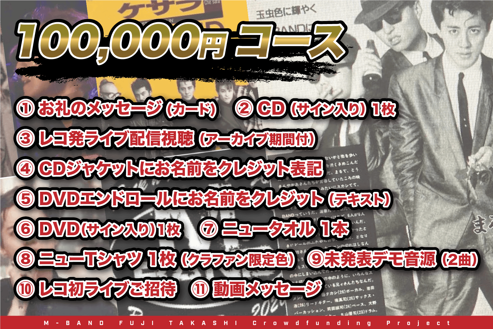 ◆100,000円コース (1)お礼のメッセージ(カード)、(2)CD(サイン入り) 1枚、(3)レコ発ライブ配信視聴(アーカイブ期間付)、(4)CDジャケットにお名前をクレジット表記(テキスト)、(5)DVDエンドロールにお名前をクレジット(テキスト大)、(6)DVD(サイン入り)1枚、(7)ニュータオル 1本、(8)ニューTシャツ 1枚(クラファン限定色)、(9)未発表デモ音源(2曲)、(10)レコ発ライブご招待、(11)動画メッセージ