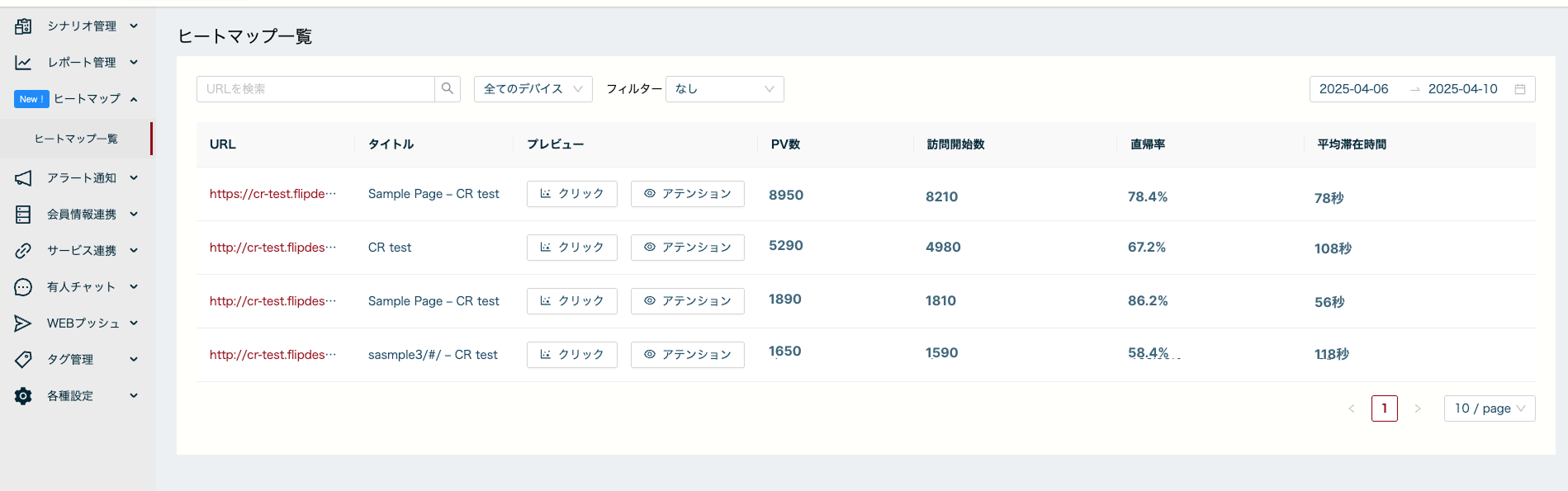 ページURL、期間・デバイス・セグメント(Flipdeskのシナリオ、CV等)別に、PV数、訪問開始数、直帰率、平均ページ滞在時間を表示します。