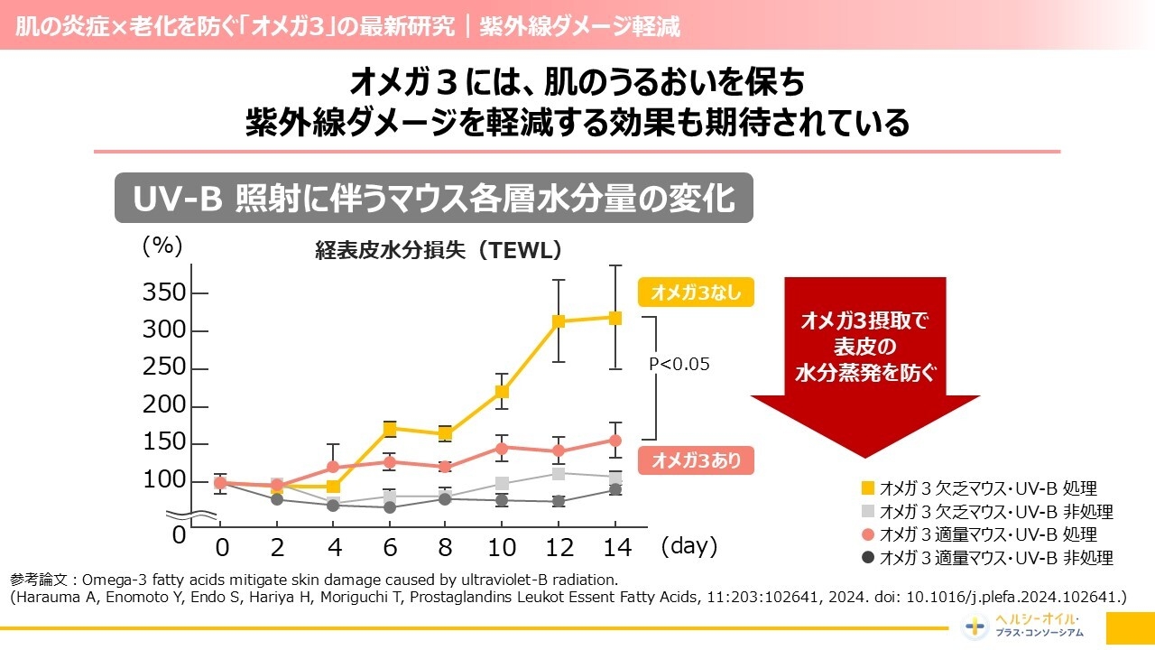 肌の炎症×老化を防ぐ最新のトピックスとして注目をされているのが、美肌成分DEL-1*です。体内で炎症が続いてしまうと、ダメージを受け続け、ターンオーバーが遅れてしまいます。炎症を引き起こすスイッチがある一方で、炎症を消すスイッチがあります。それがDEL-1です。DEL-1は体内でつくられ、炎症を抑える「抗炎症たんぱく質」のことです。肌の細胞間の炎症を鎮め、肌の修復力を保つ、いわば消火剤のような役割を果たします。このDEL-1は、近年の研究では加齢に伴い、減少が加速してしまうことがわかっています。例えば、昔はすぐ治った傷が治りにくくなる、ニキビ跡が残ってしまうなど、この減少が関係しているかもしれません。DEL-1の減少は、炎症の悪循環を生んでしまうため、老化を防ぐためには何とかしたいポイントです。ここで役立つのがオメガ3です。実はオメガ3の継続した摂取によって、DEL-1を増やすことがわかってきています。さらにもう一つのトピックスで、オメガ3が肌の潤いを保ち、紫外線ダメージを軽減する効果がある可能性がわかってきました。マウスによる試験ですが、オメガ3が不足している群は肌のバリア機能が乱れ、肌の構造が乱れる結果となった一方で、オメガ3を適度に摂取した群は、肌の水分量が保たれ、肌構造の乱れも少ない結果となりました。