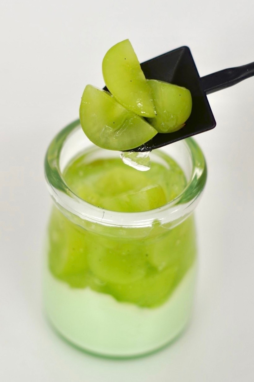 徳島県産のシャインマスカットをレモンとバニラで香り付けしたジュレの中にたっぷりと閉じ込めました。マスカット入りのジュレと、なめらかなプリンの2層に分かれており、口の中でマスカットの果汁が弾けます!