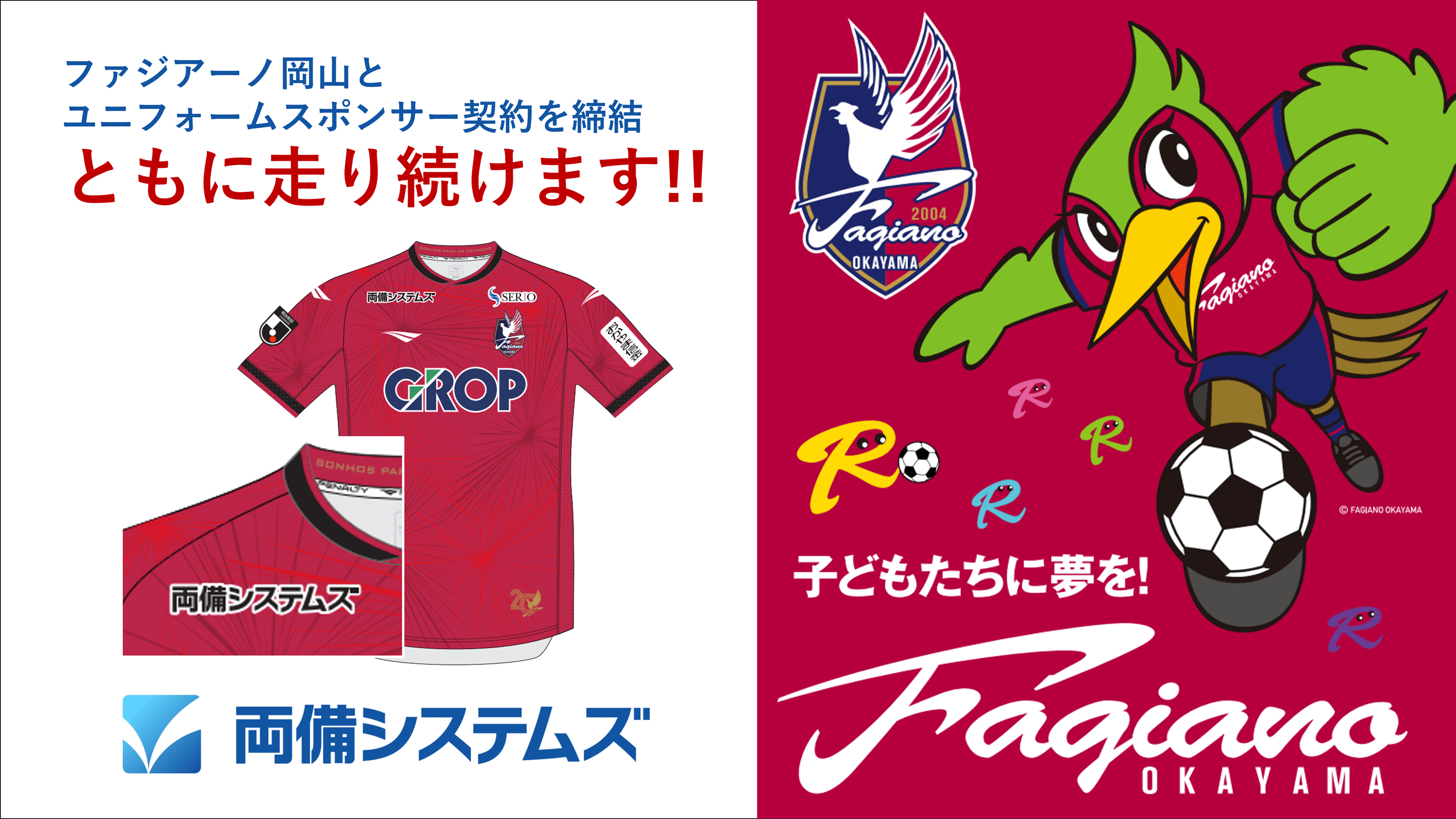 株式会社両備システムズ(本社:岡山県岡山市、代表取締役社長:松田 敏之、以下 当社)は、地域スポーツの振興と岡山のさらなる発展を目指し、Jクラブ ファジアーノ岡山(所在地:岡山県岡山市、代表取締役社長 森井 悠)と百年構想リーグ及び2026-27シーズンにおけるユニフォームスポンサー契約を締結したことをお知らせいたします。