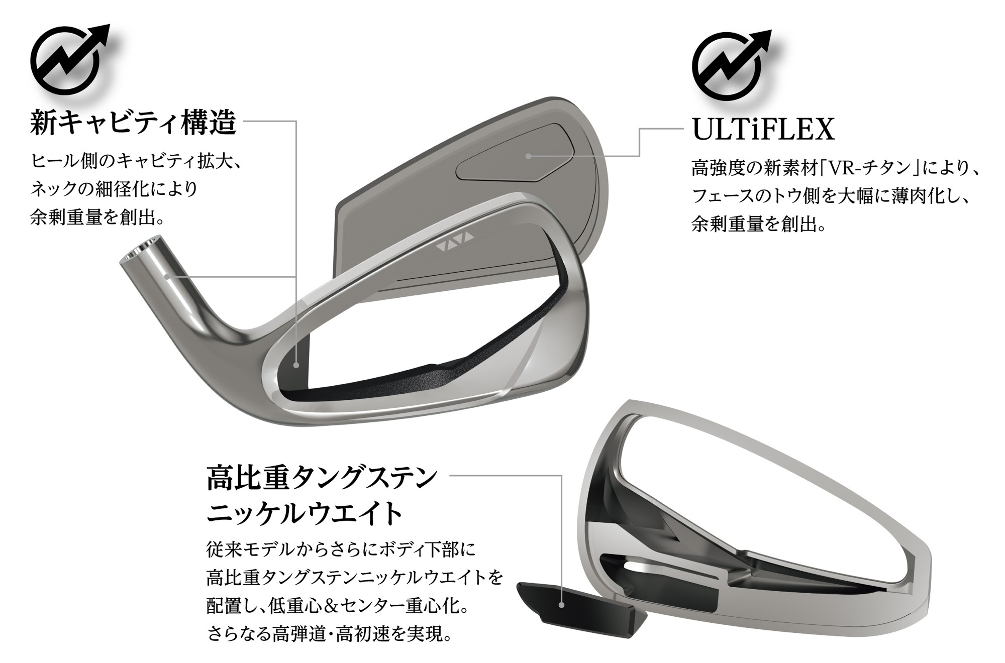 高強度の新素材「VR-チタン」を搭載した「ULTiFLEX」により、フェースのトウ側を大幅に薄肉化。ヒール側のキャビティを拡大し、ネック径を細くした「新キャビティ構造」と合わせ、余剰重量を創出。あわせて「高比重タングステンニッケルウエイト」を従来モデル※よりさらにボディ下部に配置することで低重心&センター重心化し、さらなる高弾道・高初速を実現しました。