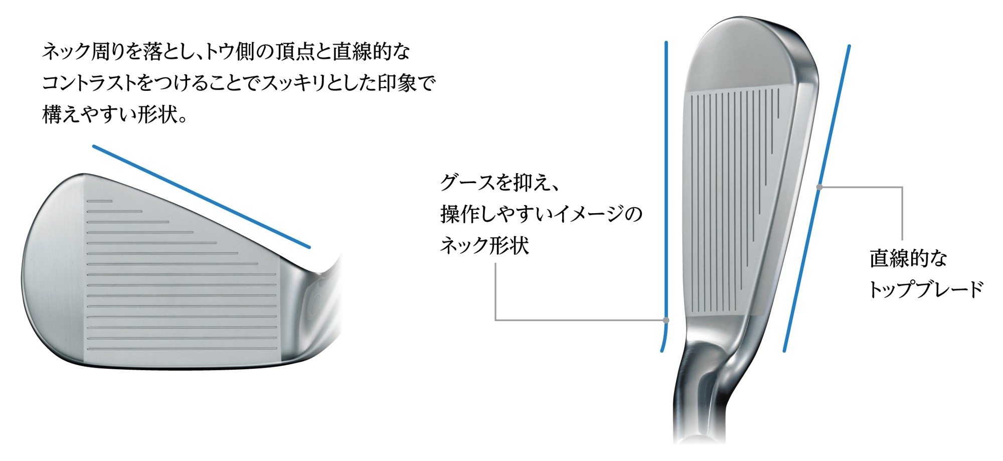 ネックはグースを抑え、操作しやすいイメージの形状を採用。ネック周りの肉を落とし、トウ側の頂点と結んだ直線的なトップブレードが構えやすい印象を与えます。