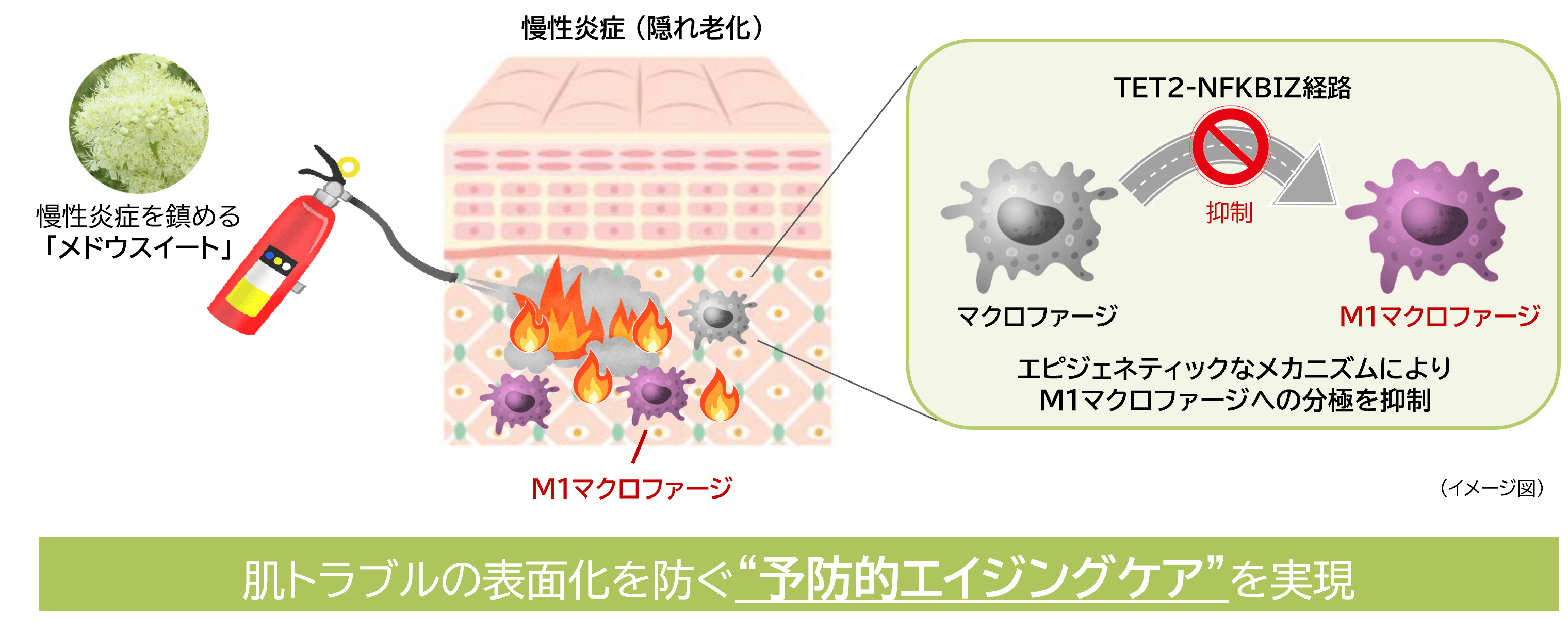 「メドウスイート」が、TET2-NFKBIZ経路を介するエピジェネティックなメカニズムにより、加齢によるM1マクロファージへの過剰な分極を抑えることで、慢性的な肌の炎症を鎮める効果が期待できます。これは、加齢に伴う肌トラブルが表面化する前に原因となる炎症の芽を摘む、“新たな予防的エイジングケア”の可能性を示しています。この研究成果は今後の基礎化粧品の開発に応用する予定です。