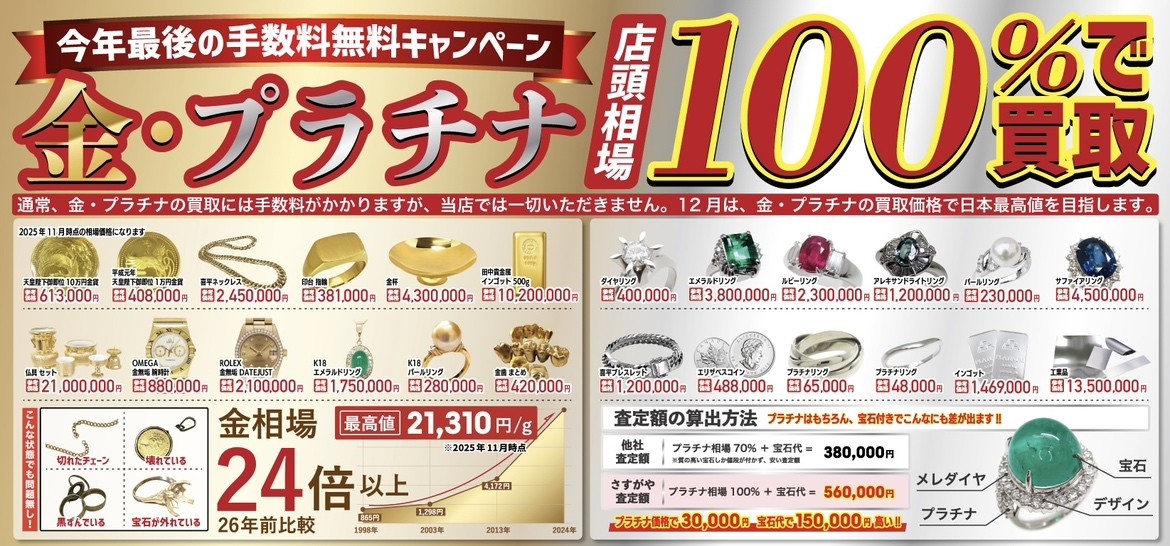 金・プラチナ相場が過去最高水準となっている今、貴金属の売却には絶好のタイミングです。12月中は、手数料無料で、店頭相場100%での買取を実施。査定方法も明朗で、他店と比較しても差額が一目瞭然です。