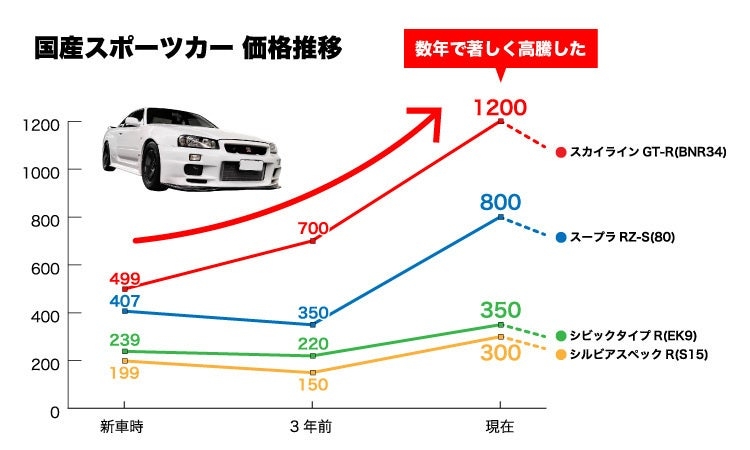 旧車はここ数年で価格の高騰が著しく、新車価格の2倍、3倍まで価格が上がったものもありプレミア価格がついているものもしばしば見受けられます。