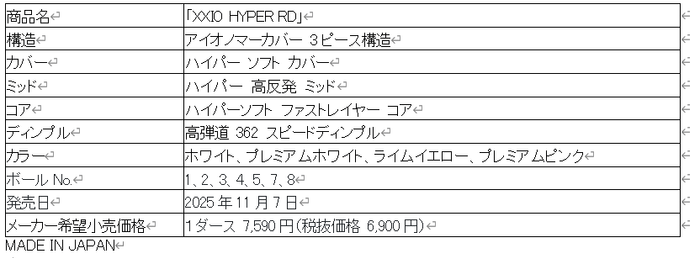 住友ゴムグループの(株)ダンロップスポーツマーケティングは、進化したダンロップ独自の3層構造と新開発ディンプルが大きな飛びを実現、また新開発のカバーがショートアイアンやウエッジでの優れたスピン性能を発揮し、更にソフトな打感を徹底追求した「飛ぶ×止まる×ソフトな打感」の3拍子揃った「XXIO HYPER RD」を、2025年11月7日から販売します。メーカー希望小売価格は1ダース 7,590円(税抜価格 6,900円)です。