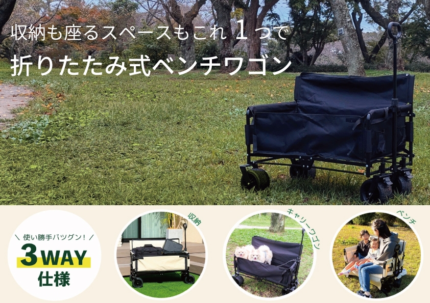 「ベンチワゴン」は、アウトドアや日常生活、非常時に便利な3WAY仕様の多機能ワゴンです。