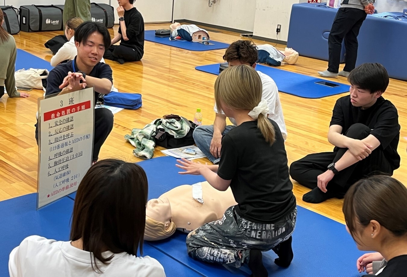 「防災救命クラブDPLS(ディプルス)」は救急法講習や防災活動を通じて命の大切さを市民に啓発するために神戸国際大学リハビリテーション学部の学生を中心に2010年に発足しました。部員の多くが神戸市の「救急インストラクター資格」を取得しており、地元住民や本学学生、企業従業員や中高教職員に対する救命講習などを行っています。その他にも2022年の「ぼうさいこくたい兵庫」への出展や兵庫県自治学会研究発表会での研究発表なども行っています。