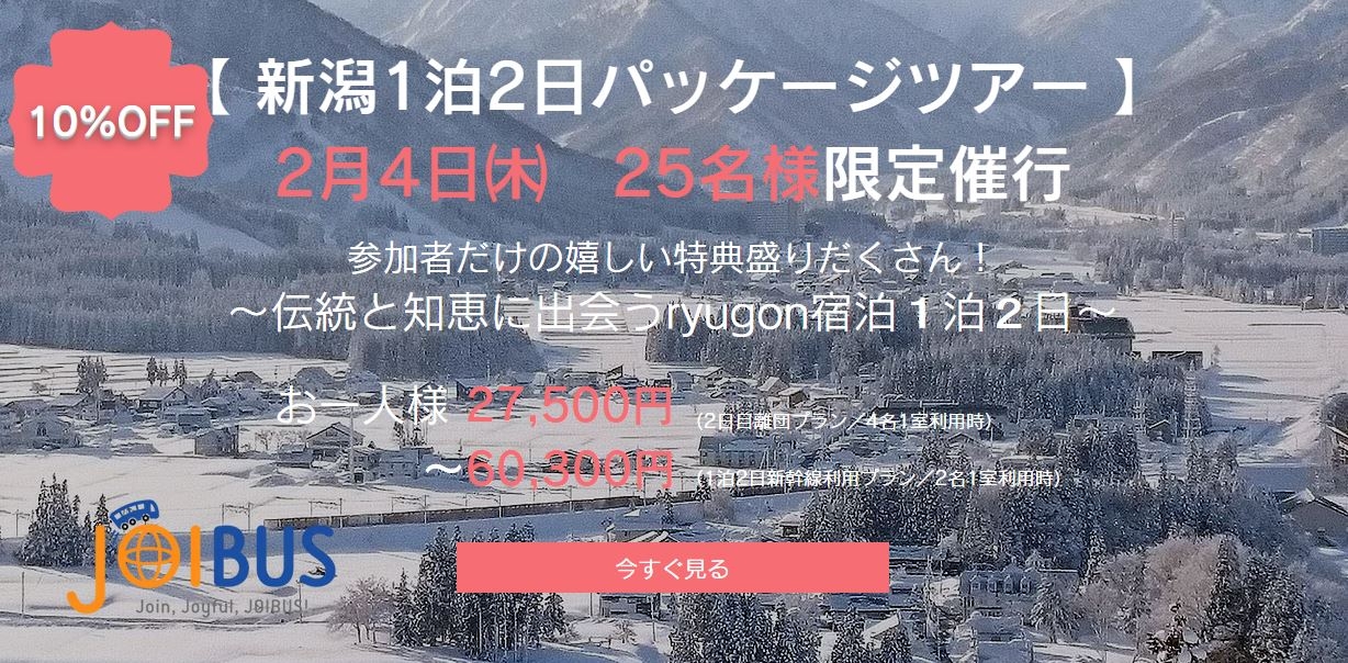 今回、みゅうJapanでは2020年度ジャパン・ツーリズム・アワードで観光庁長官賞を受賞した「JOIBUS(ジョイバス)」の初の国内版として、歴史的価値のある屋敷を全面リニューアルした人気古民家ホテル「ryugon」での滞在と、普段は内部の見学ができない漬物店や酒蔵の見学、冬の新潟らしい「かまくらバー」や「雪上サウナ体験」などお楽しみ頂けるツアーを、2月4日出発25名様限定で催行いたします。