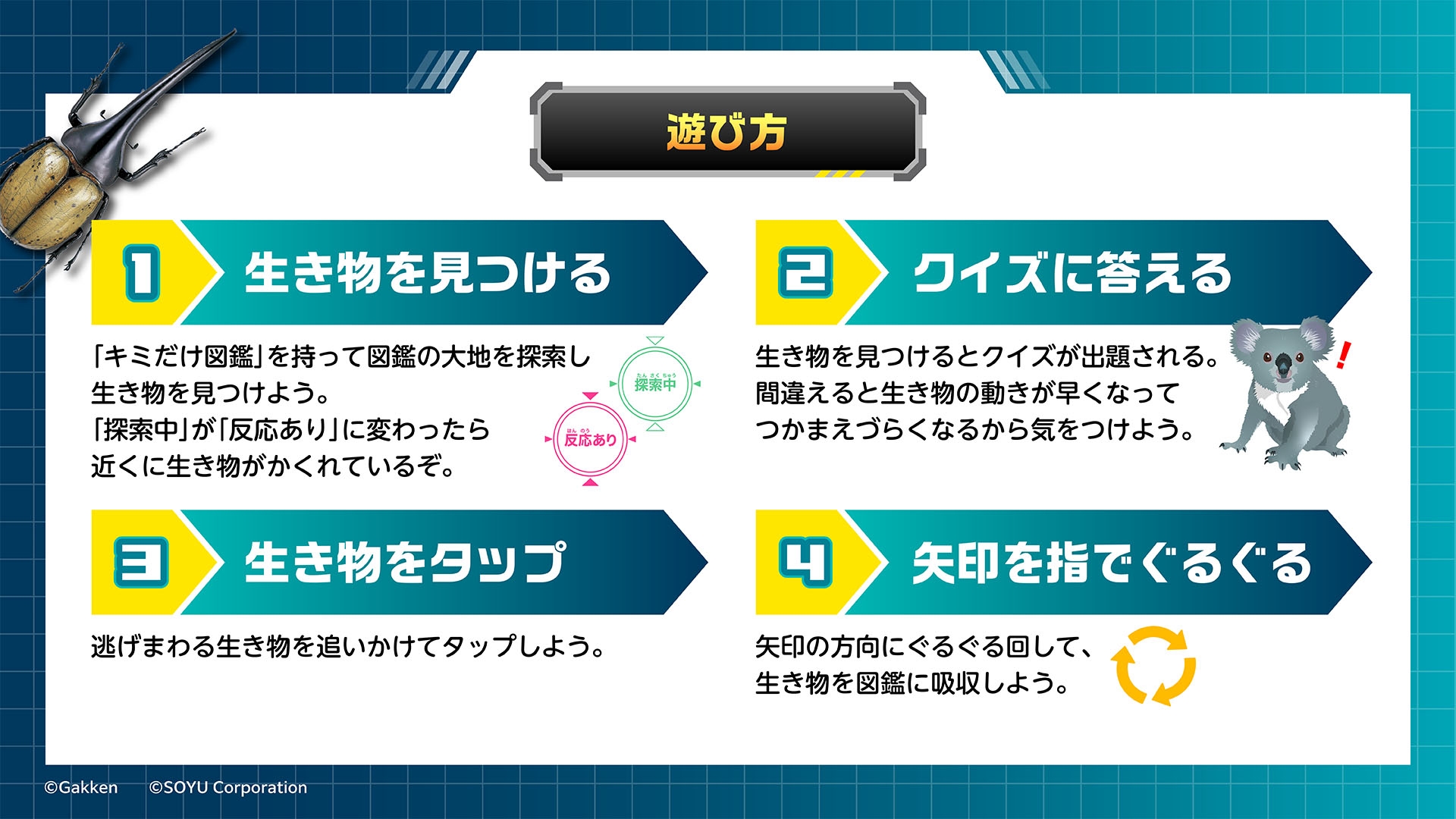 逃げる生き物たちを「キミだけ図鑑」(タブレット端末)をタップして捕まえて救出します。
