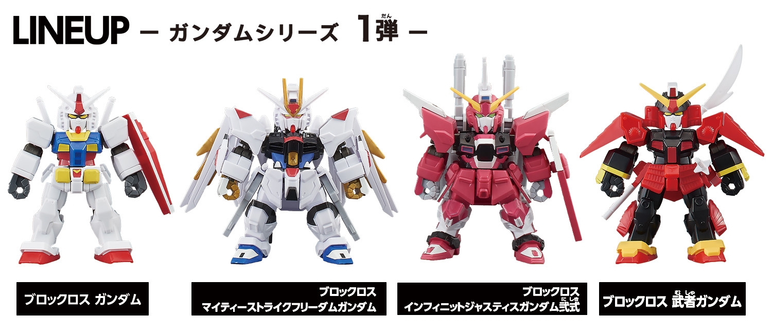 1弾は、ガンダムシリーズより『ガンダム』『マイティーストライクフリーダムガンダム』『インフィニットジャスティスガンダム弐式』『武者ガンダム』の4商品、ワタルシリーズより、『龍神丸(魔神創造伝ワタル)』『麒麟丸』『風神丸』『龍神丸(魔神英雄伝ワタル)』の4商品がラインアップ。