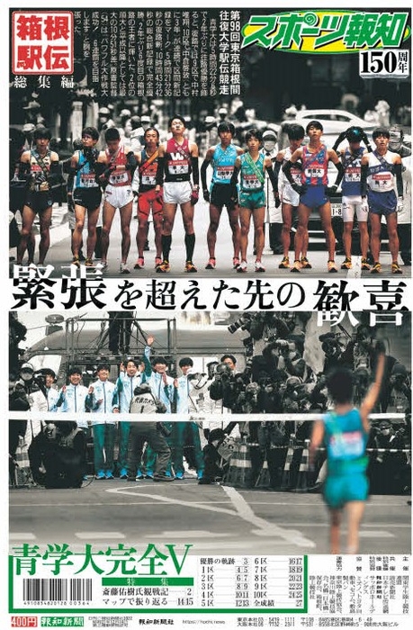 1月2,3日に行われた第98回東京箱根間往復大学駅伝競走(箱根駅伝=報知新聞社後援)は往路を制した青学大が5時間21分36秒の復路新、10時間43分42秒の総合新記録で完全優勝を果たしました。「箱根駅伝総集編」(タブロイド判28ページ、オールカラー、税込み400円)では全区間の詳報、箱根路を走った全210名のランナーの写真などを掲載。プロ野球前日本ハム投手の斎藤佑樹氏の観戦記など盛りだくさんの内容です。