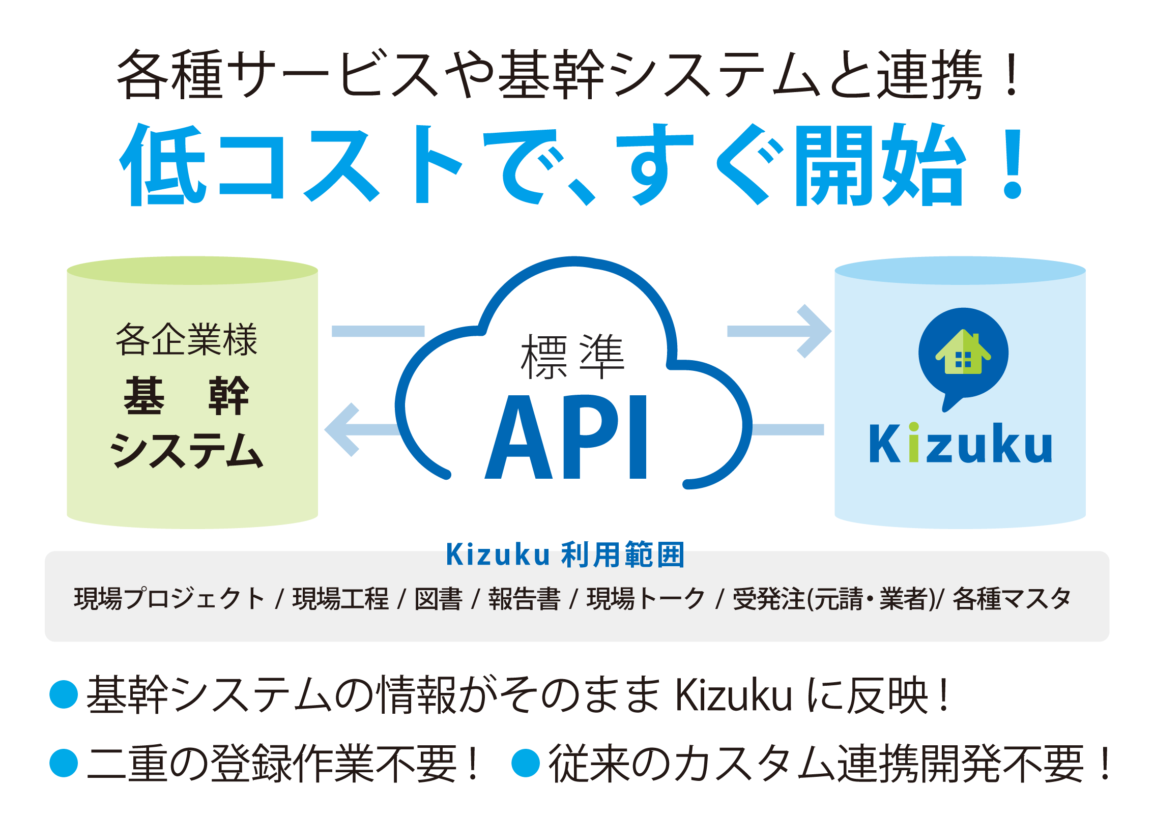 当機能により、各元請会社の基幹システムをはじめ様々なサービスと、施工管理アプリ「Kizuku/キズク」の情報連携が低コストで、すぐに始めることが可能となります。