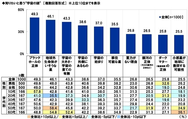 世代別にみると、10代では「ブラックホールの正体」(57.8%)、20代では「ダークマター(暗黒物質)の正体」(31.3%)、50代では「地球外生命体がいそうな星」(58.4%)と「銀河の正体(天の川銀河の正体など)」(31.9%)、60代では「宇宙の大きさ・宇宙の果ての有無」(52.4%)と「小惑星が地球に衝突する可能性」(36.1%)がそれぞれ他の世代と比べて高くなりました。