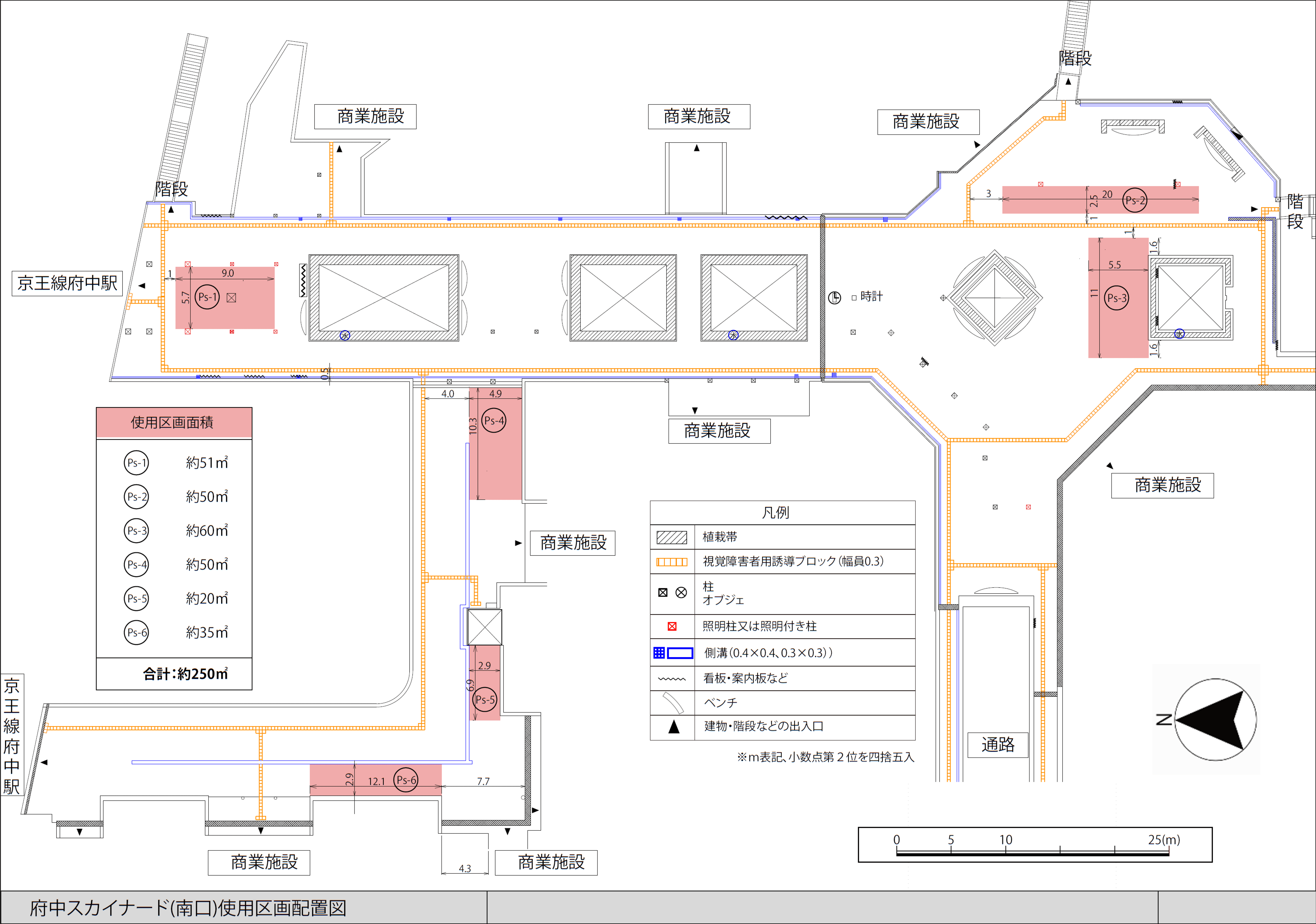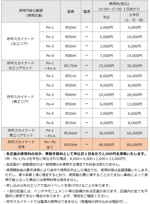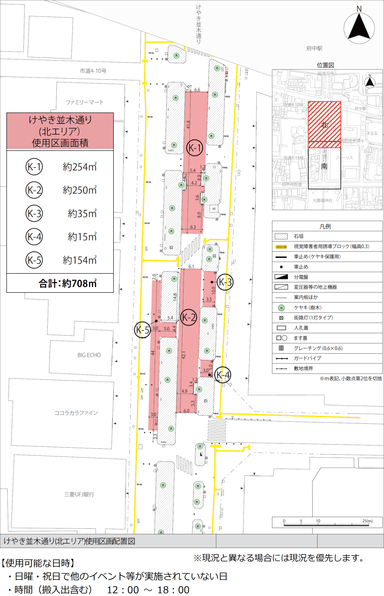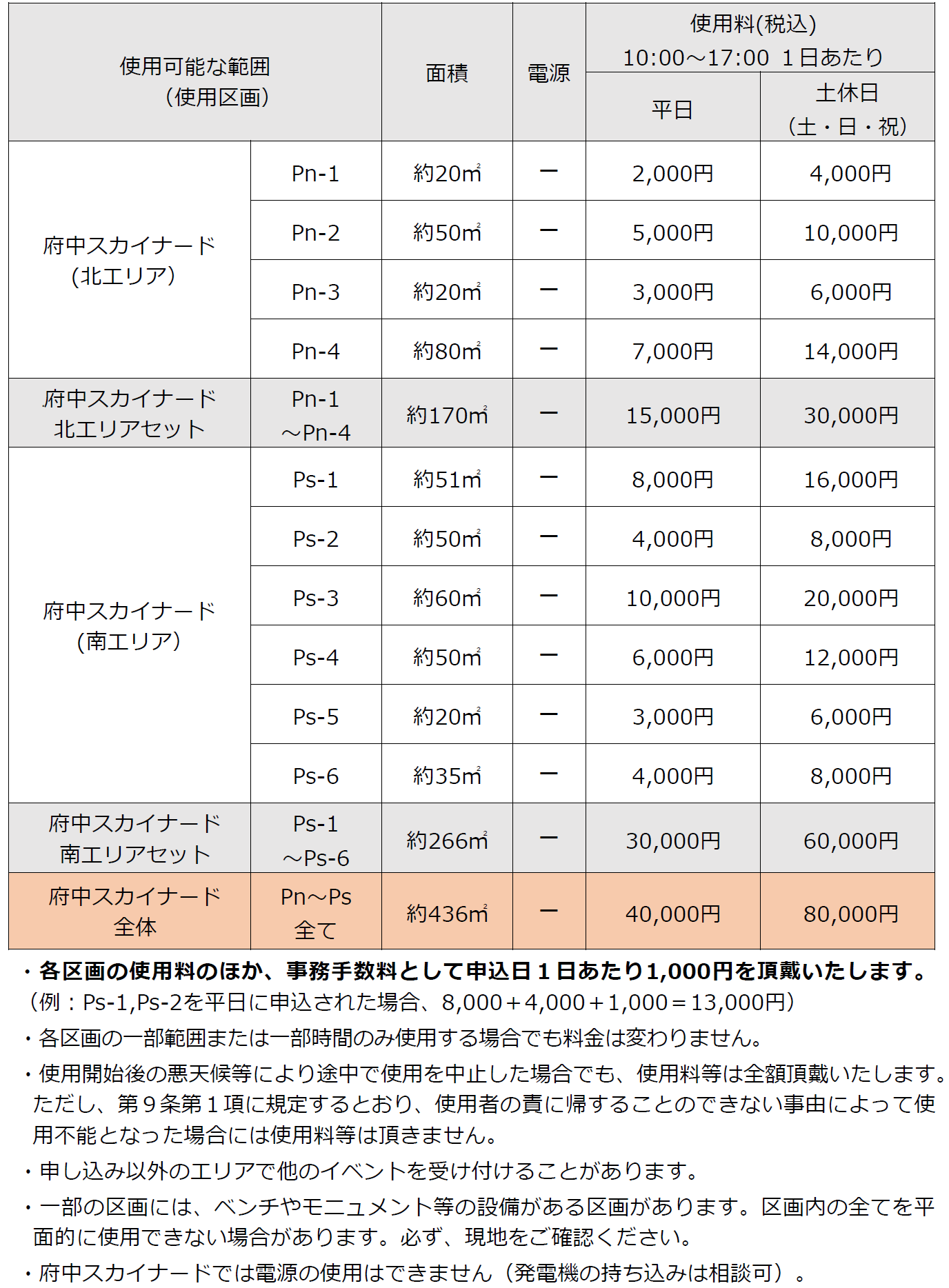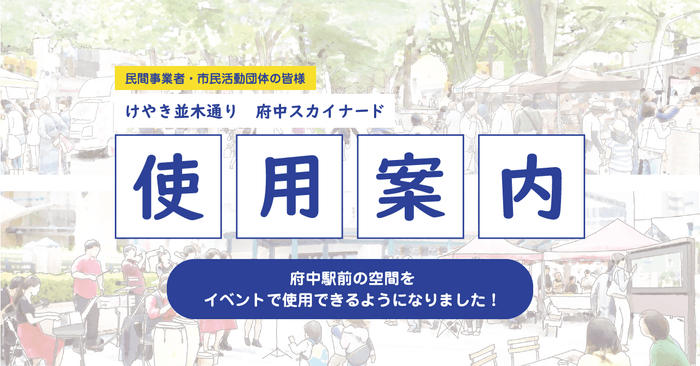 使用希望者は、けやき並木通りと府中スカイナード北口・南口(ペデストリアンデッキ)の指定のエリアを使用することが出来ます。