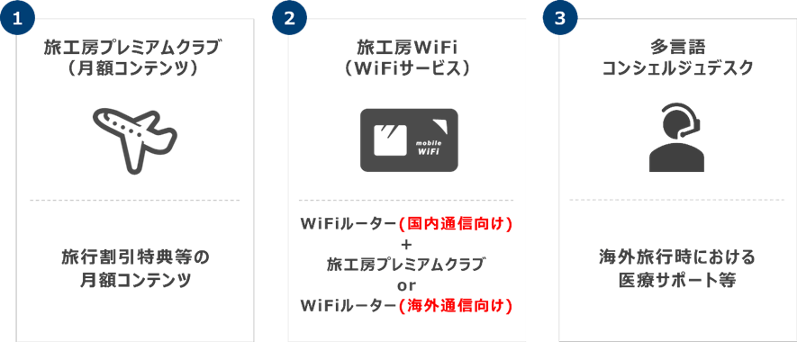 合弁会社では、旅工房による旅行割引特典などが受けられる「①旅工房プレミアクラブ(仮称)」、光通信グループから提供される通信サービスを活用した国内旅行者向けのインターネットサービス「②旅工房Wi-Fi(仮称)」並びに、インバウンドテックから海外旅行者向け「②旅工房グローバルWi-Fi(仮称)」及び海外旅行時のコロナ感染や医療相談など、旅行先で使える通訳サービス「③多言語コンシェルジュデスク(仮称)」のサービスの企画・提供を予定しており、今後もサービスメニューは随時拡大してゆく予定です。