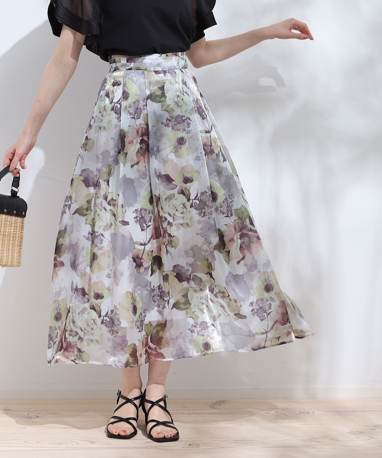 『オーガンフルールタックベルトスカート』は、キラキラの糸が織り込まれた光沢感の美しいオーガンジー生地に大胆なオリジナルの花柄デザインが目を引く “主役級”スカートです。